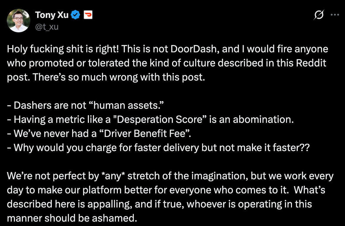 That sounds horrifically predatory, so much so that Tony Xu, the CEO of DoorDash, responded to the allegations by categorically denying that his company would ever do something like that: