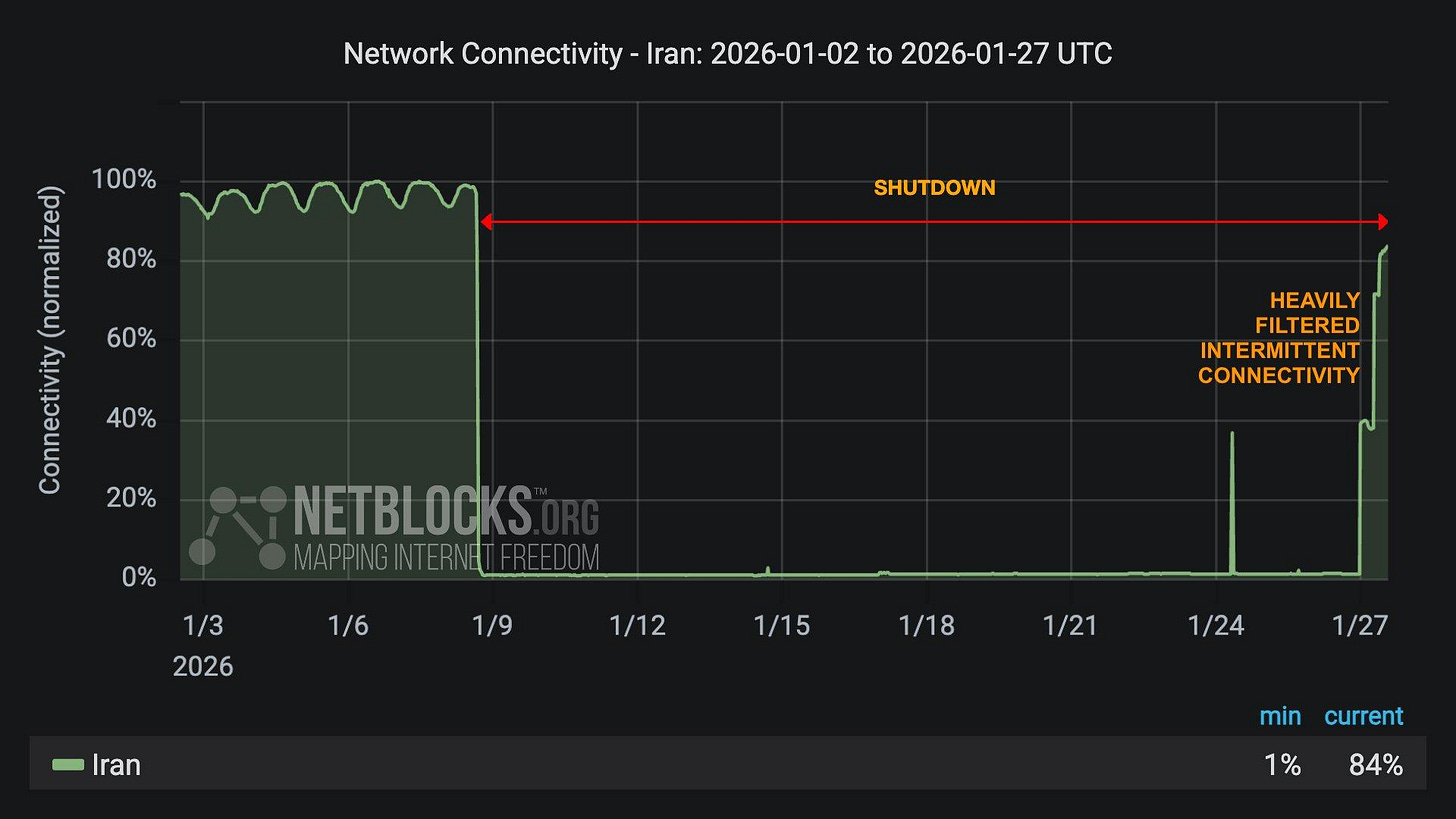 On 8 January, the Iranian government turned off the internet. Like, off. The blackout continued until 27 January, when “heavily filtered intermittent connectivity” began to return.