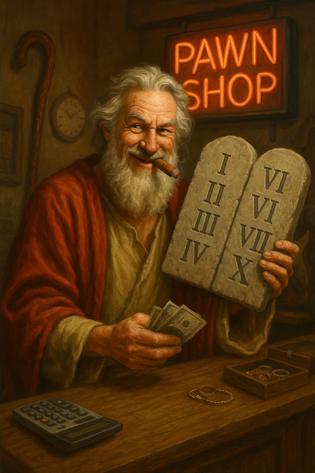 I can make a humorous, stylized version with a Moses-like figure in a pawnshop setting, holding stone tablets and negotiating, maybe with a sly grin and a cigar for a comedic twist.