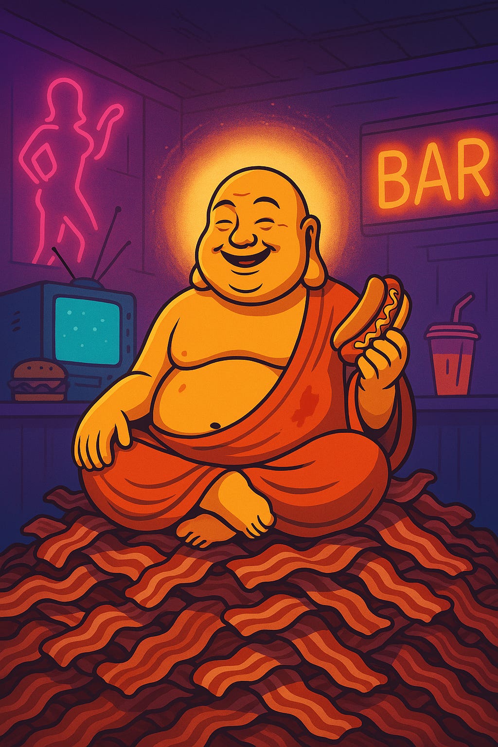 “That is top notch,” I replied. “Could I have an image of the Buddha meditating in a strip club on a pile of bacon?”