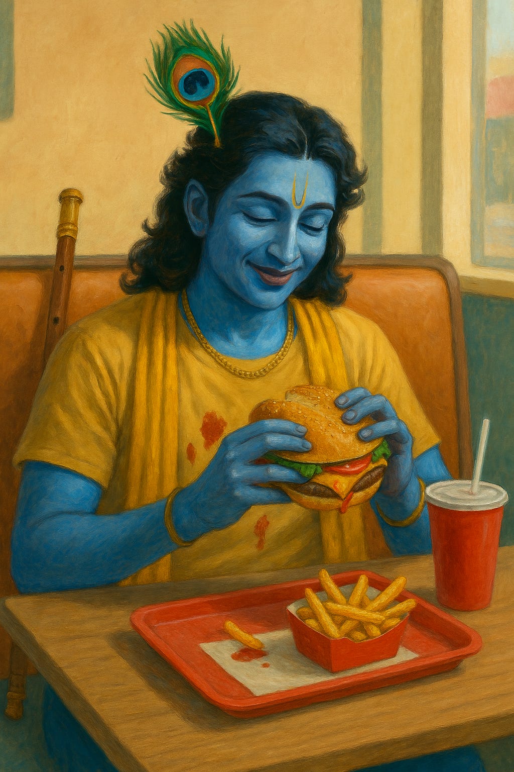 Krishna in a modern setting, enjoying a vegetarian burger (paneer or veggie patty).