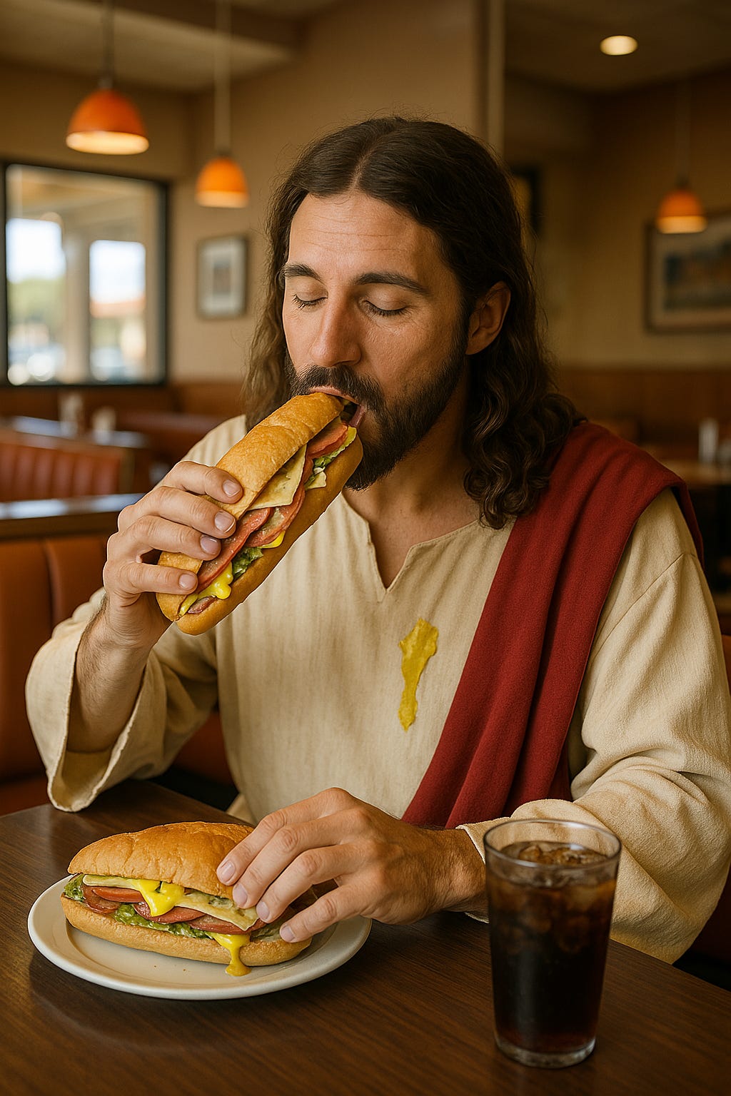 I responded with “I'll take Jesus in a casual diner eating a hoagie with a little mustard mess on his robe, please.”